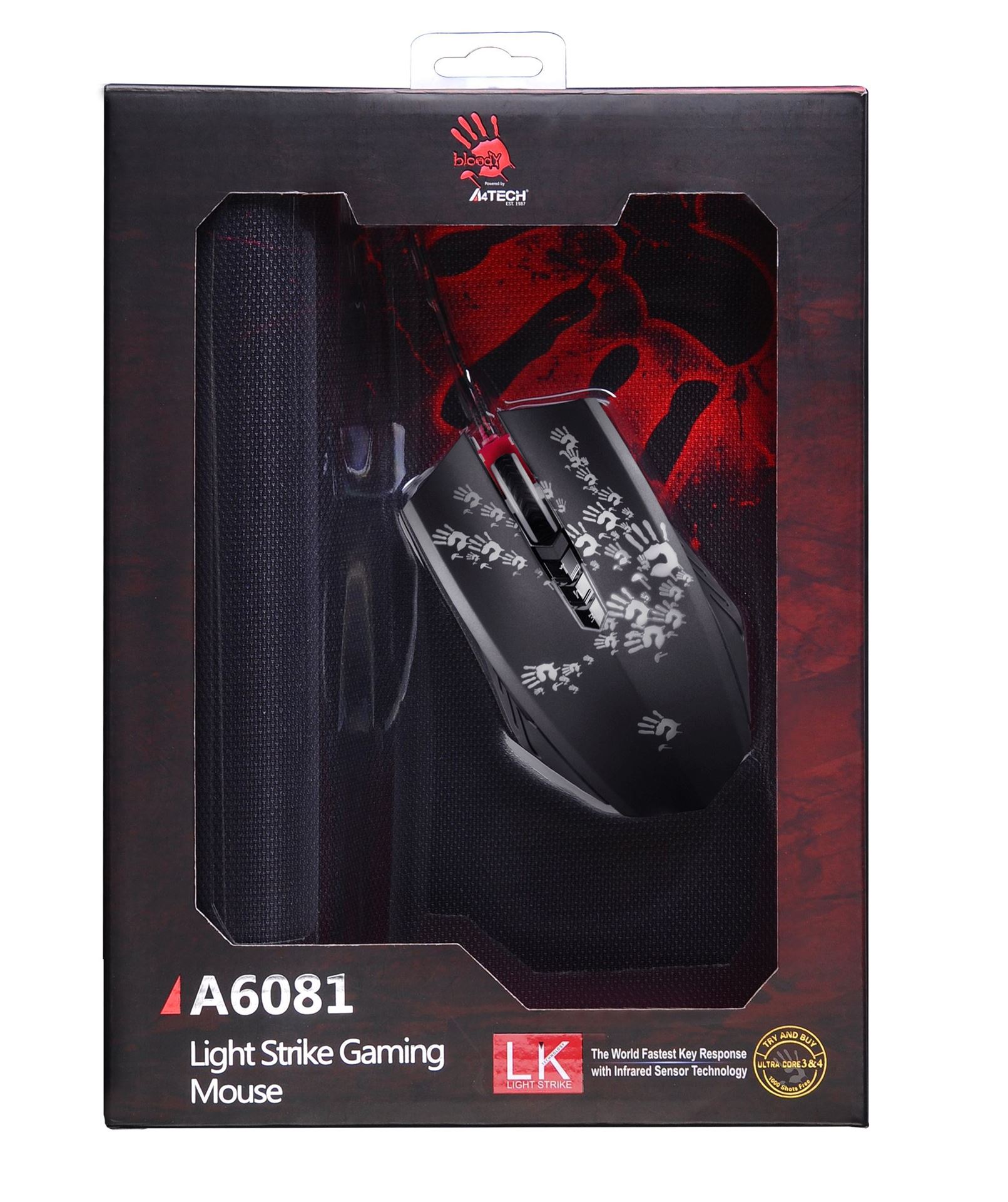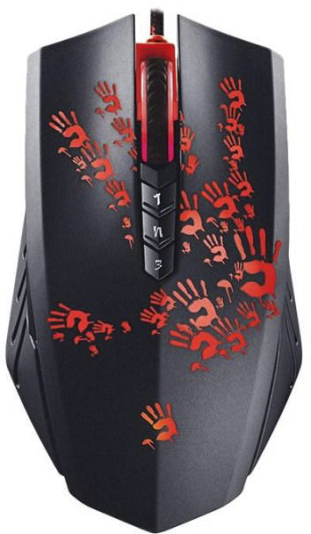 Мышь проводная A4Tech Bloody A6081 – игровой набор, в который входит игровая мышь с максимальным разрешением оптического датчика, равным 4000 dpi, игровой коврик и 2 стильные наклейки. Дизайн мыши полностью оправдывает ее название: одного лишь взгляда на манипулятор достаточно для того, чтобы это осознать. В наличии разноцветная подсветка и 8 кнопок. Частота опроса мыши равна 1000 Гц.