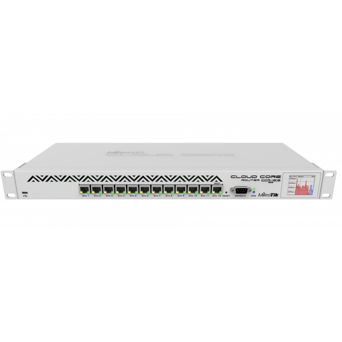 Устройство доступно в стоечном корпусе 1U, имеет двенадцать гигабит портов Ethernet, последовательный консольный кабель и порт USB. CCR1016-12G имеет два слота SODIMM, по умолчанию он поставляется с 2ГБ оперативной памяти, но не имеет ограничения памяти в RouterOS (будет принимать и использовать 16ГБ или более). Это поставляется с блоком питания и корпусом для монтажа в стойку 1U.