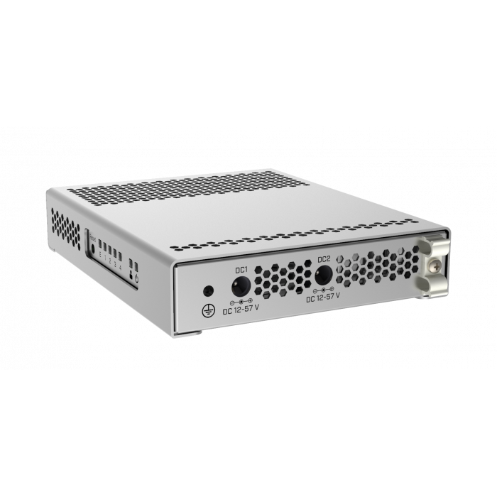 CRS305 - это компактный, но очень мощный коммутатор с четырьмя портами SFP+, со скоростью до 10 Гбит на порт. Устройство имеет медный Ethernet-порт 1Гбит для доступа к управлению и два разъема постоянного тока для резервирования питания. Устройство представляет собой очень гладкий и компактный металлический корпус без каких-либо вентиляторов для бесшумной работы.