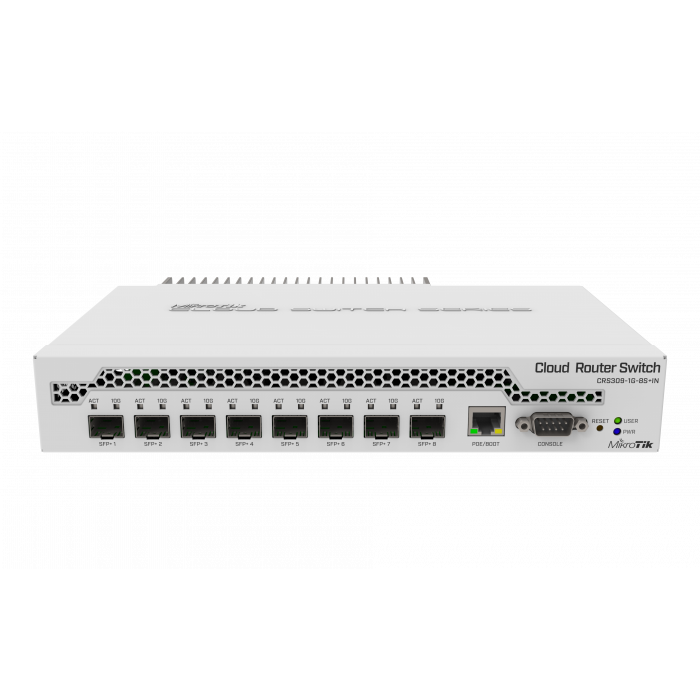 CRS309-1G-8S+ - это очень компактный, но мощный сетевой коммутатор. Он имеет восемь слотов SFP+, поддерживающих модуль до 10Гбит в каждом, что обеспечивает общую коммутационную емкость 162 Гбит/с и общую неблокирующую пропускную способность 81 Гбит/с.