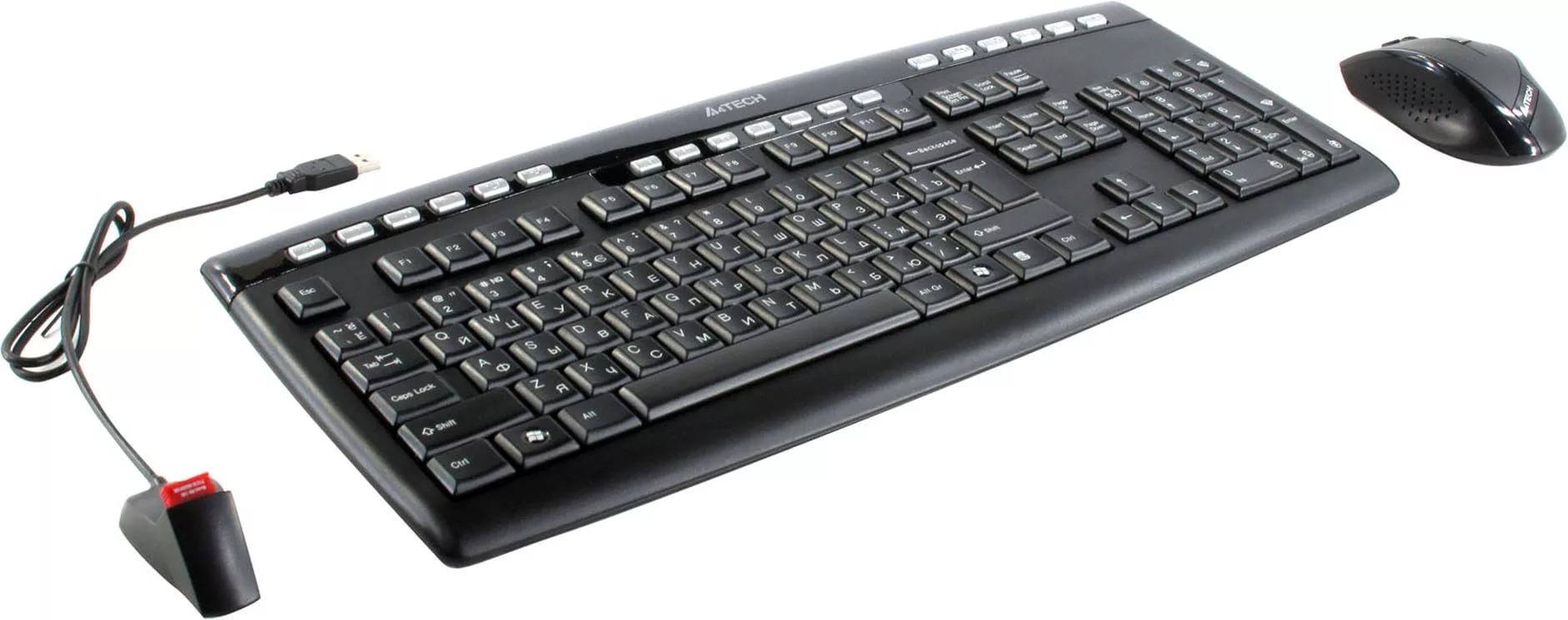USB Беспроводной комплект клавиатуры и мыши A4-Tech 9200F - серебристо-черного цвета поставляется с USB-удлинителем и батарейками. Полноразмерная клавиатура с отдельным цифровым блоком весит 664 г, имеет габариты 46.3x19x2.5 см и питается от двух AAA-батареек. Предусматривается наличие 123 клавиш, среди которых имеется 19 дополнительных кнопок.